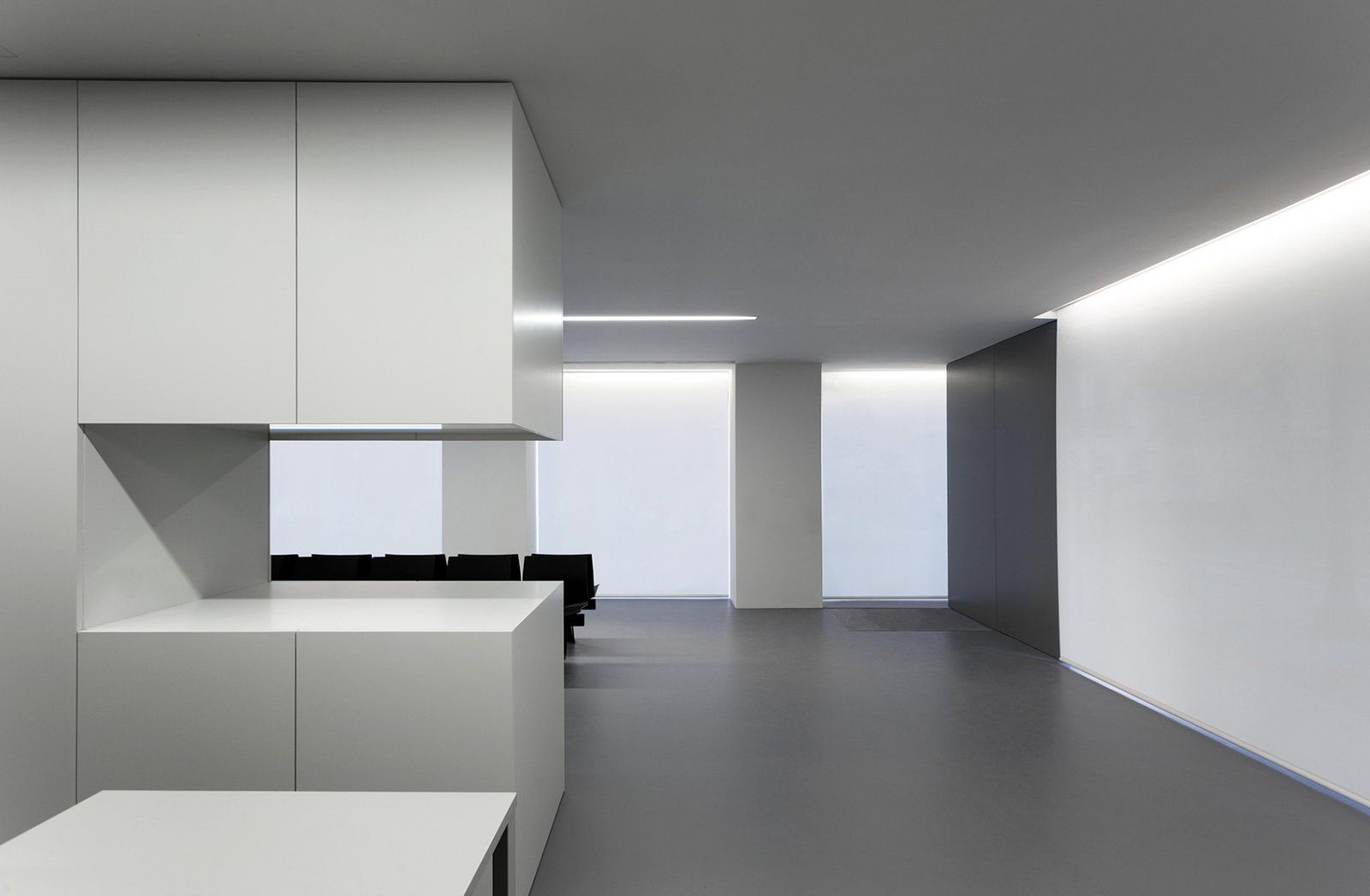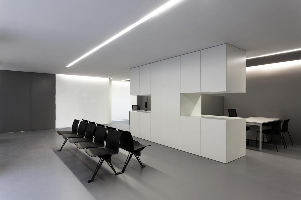 Minimalist offices typically employ a restrained color palette to maintain visual calm. The Touchthesky office uses "the most classic white as the theme with tones" combined with "quiet black" to create a harmonious environment that reduces visual noise. Similarly, the Spanish OAV office maintains a strict white and grey color scheme with concrete structures and shining surfaces to reflect light and keep the space feeling open.
