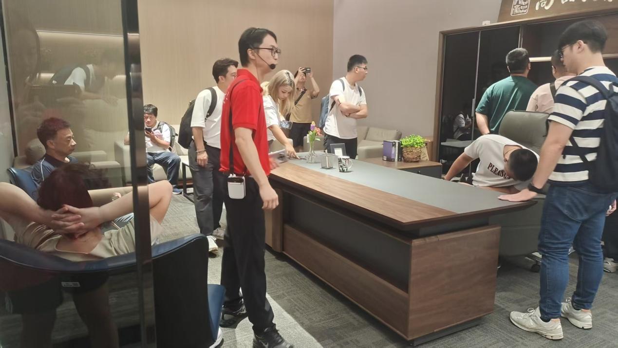 Then, led by Liang Qunsheng and Zhao Zhenyu, the Taiwanese youths stepped into Wenhao Industrial Group's furniture showroom with great curiosity. Inside, office furniture of various styles was meticulously arranged, creating a scene reminiscent of a fantastical world of workspace design.